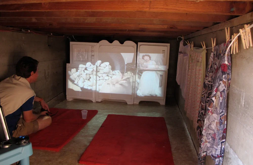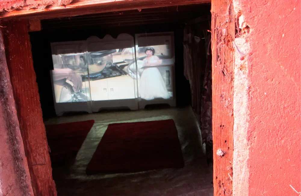 This video was simultaneously projected onto kitchen-related items such as a string of aprons and carved styrofoam kitchen appliances.
