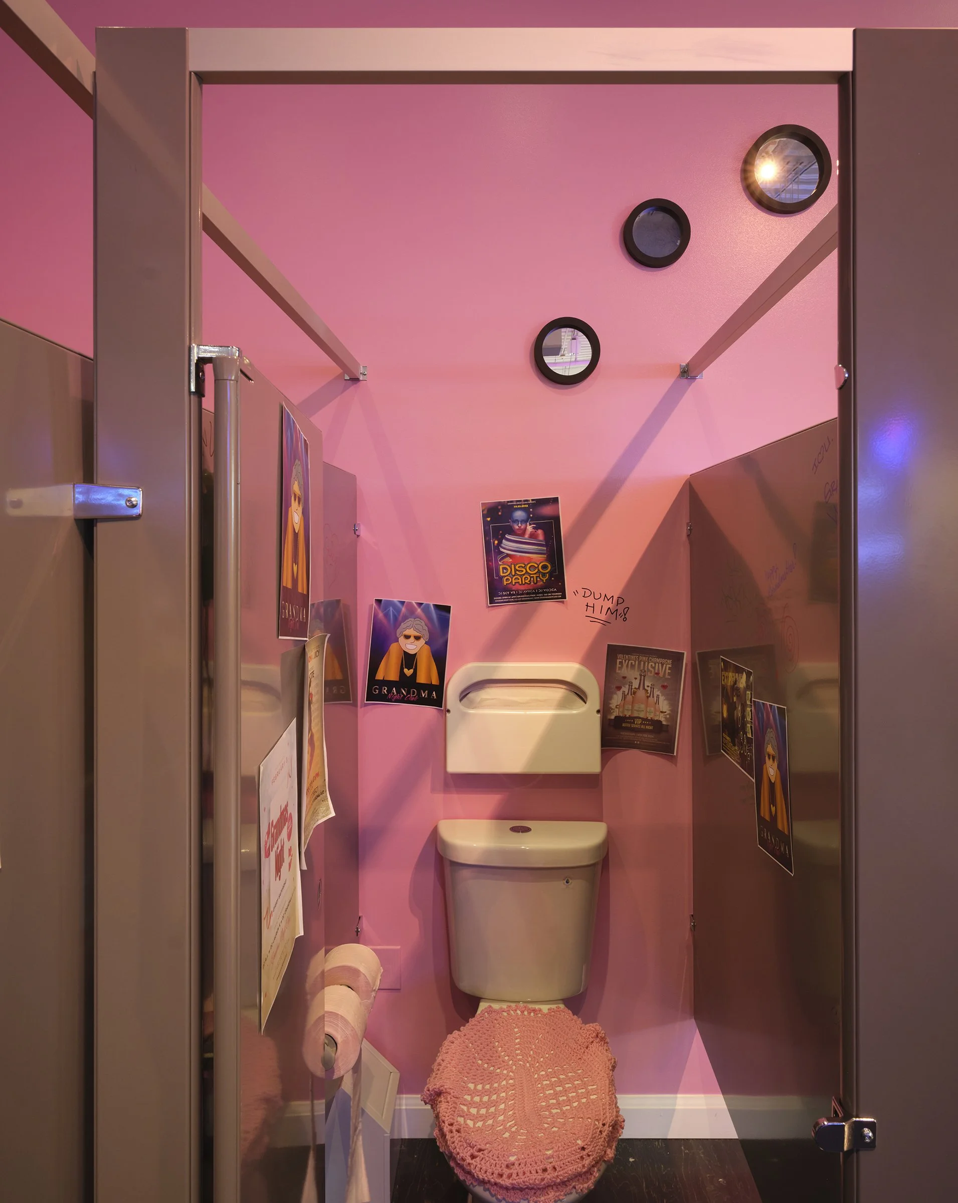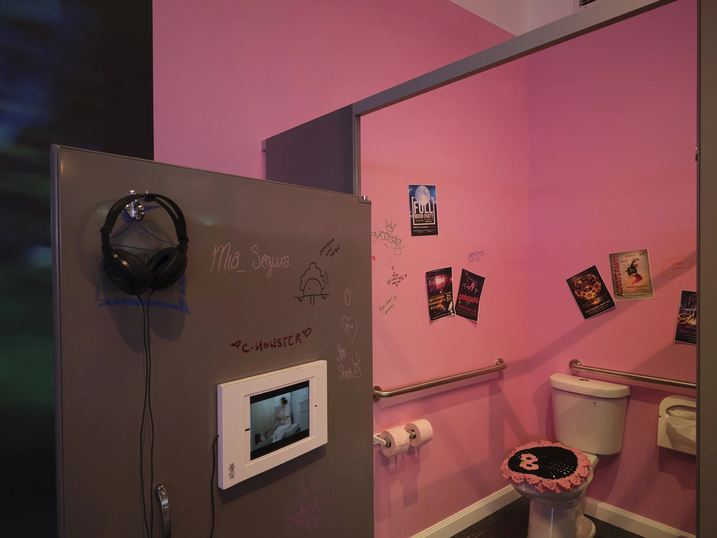The “Bathroom Stall Tears” video series, which is a part of the “Grandma Nightclub”, opens the door to a more intimate space for expression and reflections by capturing my personal childhood memories. This video is meant to be watched in the bathroom stall of the “Grandma Nightclub” installation.
