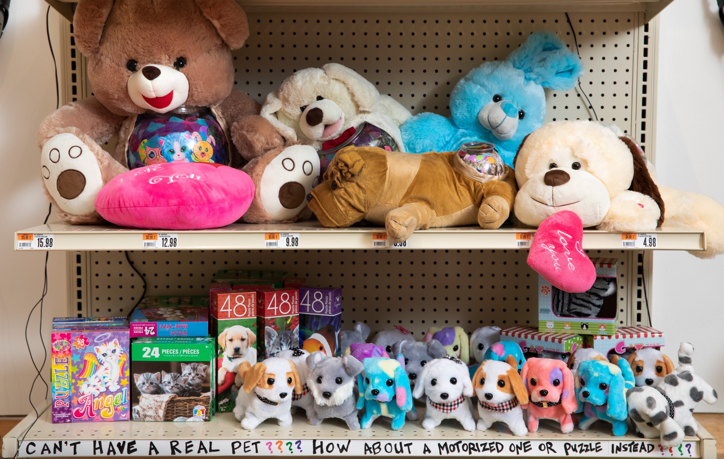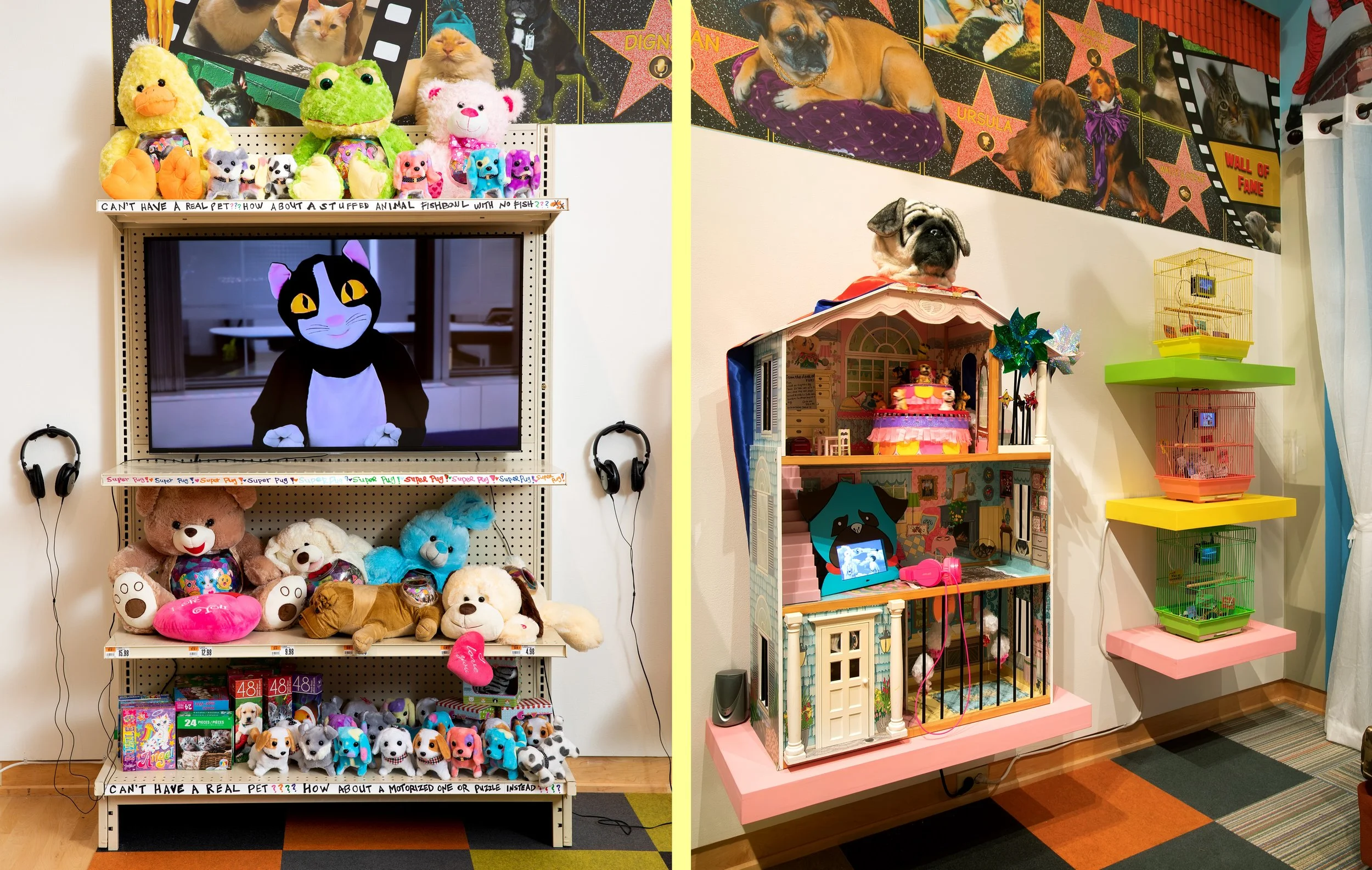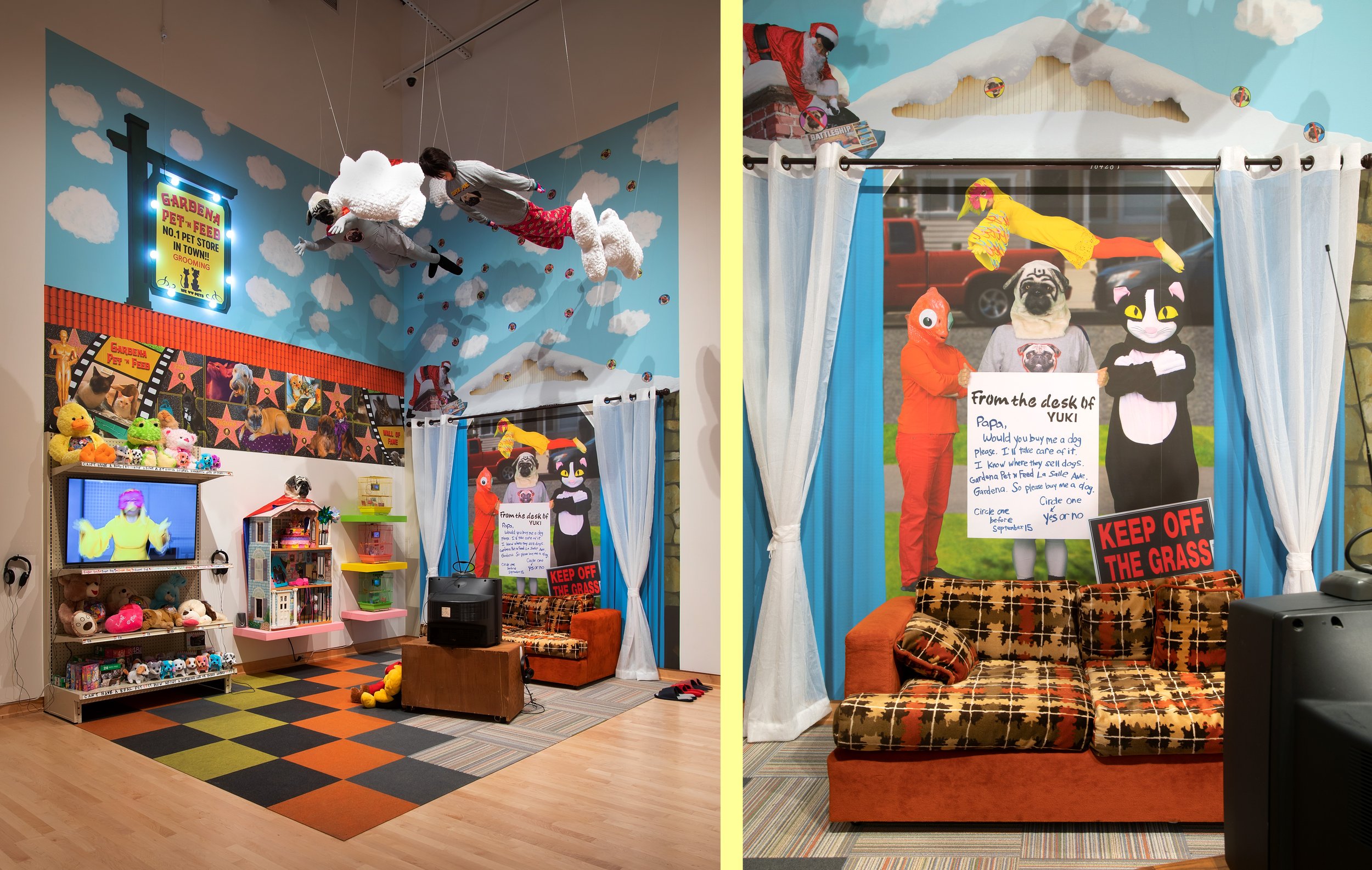 Daydream Reality is part of an ongoing series of KOKO’s Love, an East Asian/Asian American hybrid soap dramedy, that further delves into the fictional character of Yuki, the daughter of the Sakimoto patriarch Hiroshi and her quest for familial approval, especially from her father. This six-channel video is structured so it is half pet store dreamscape where her hoped-for dog lives and half living room reality, outfitted with a handwritten note and mannequins hanging from the ceiling that activate her actual home life.