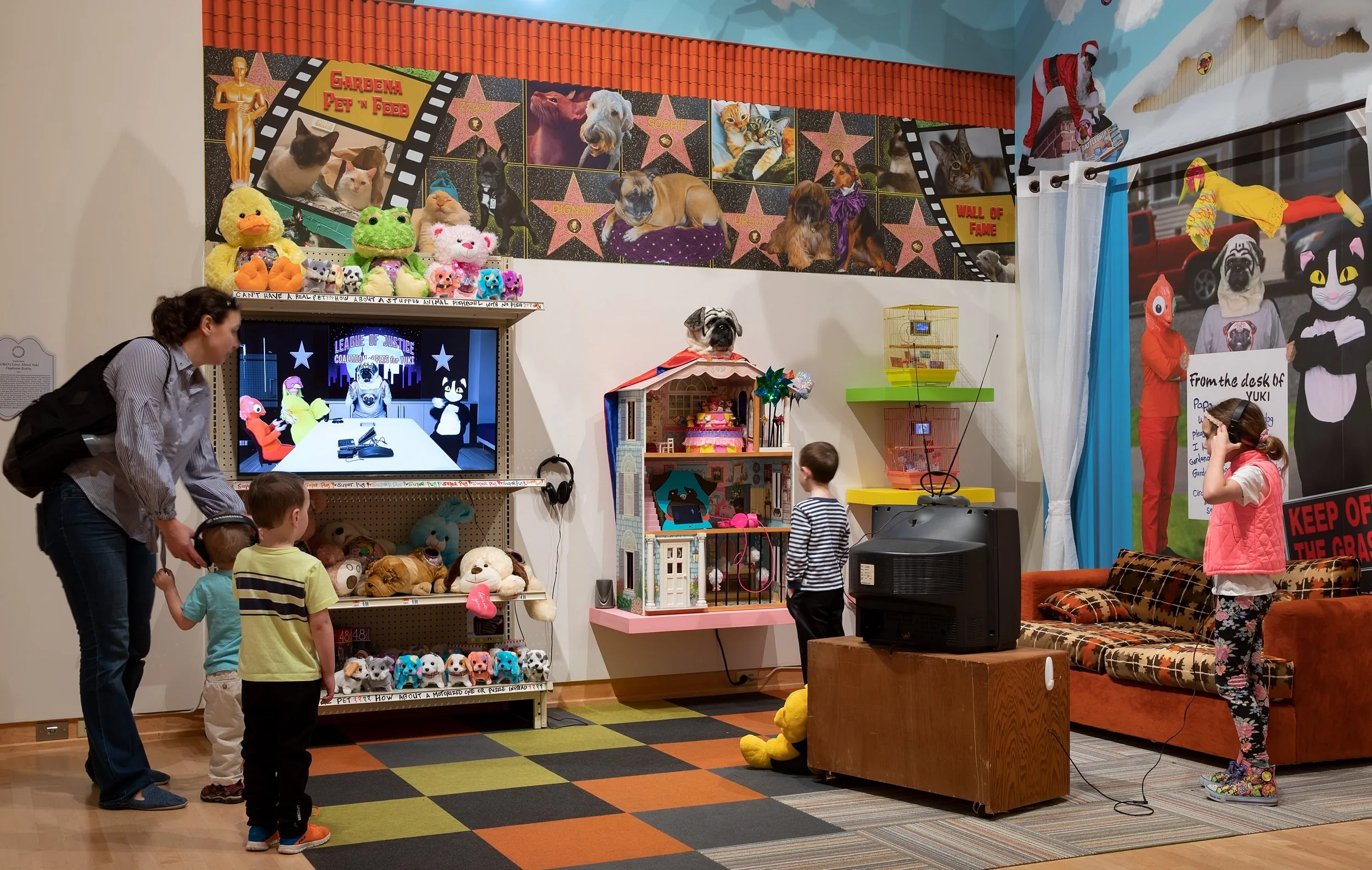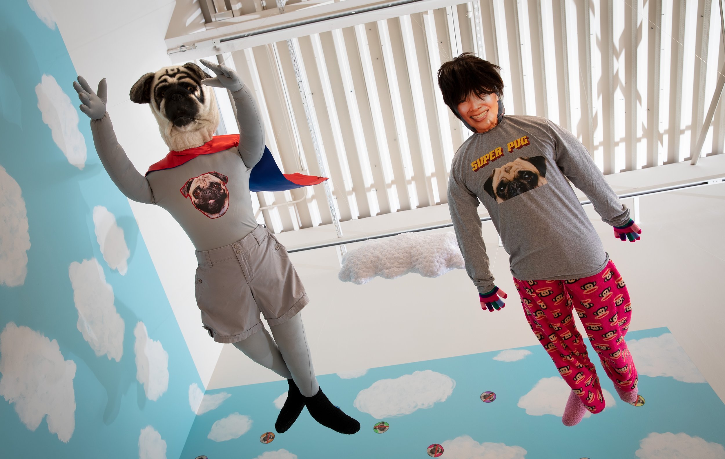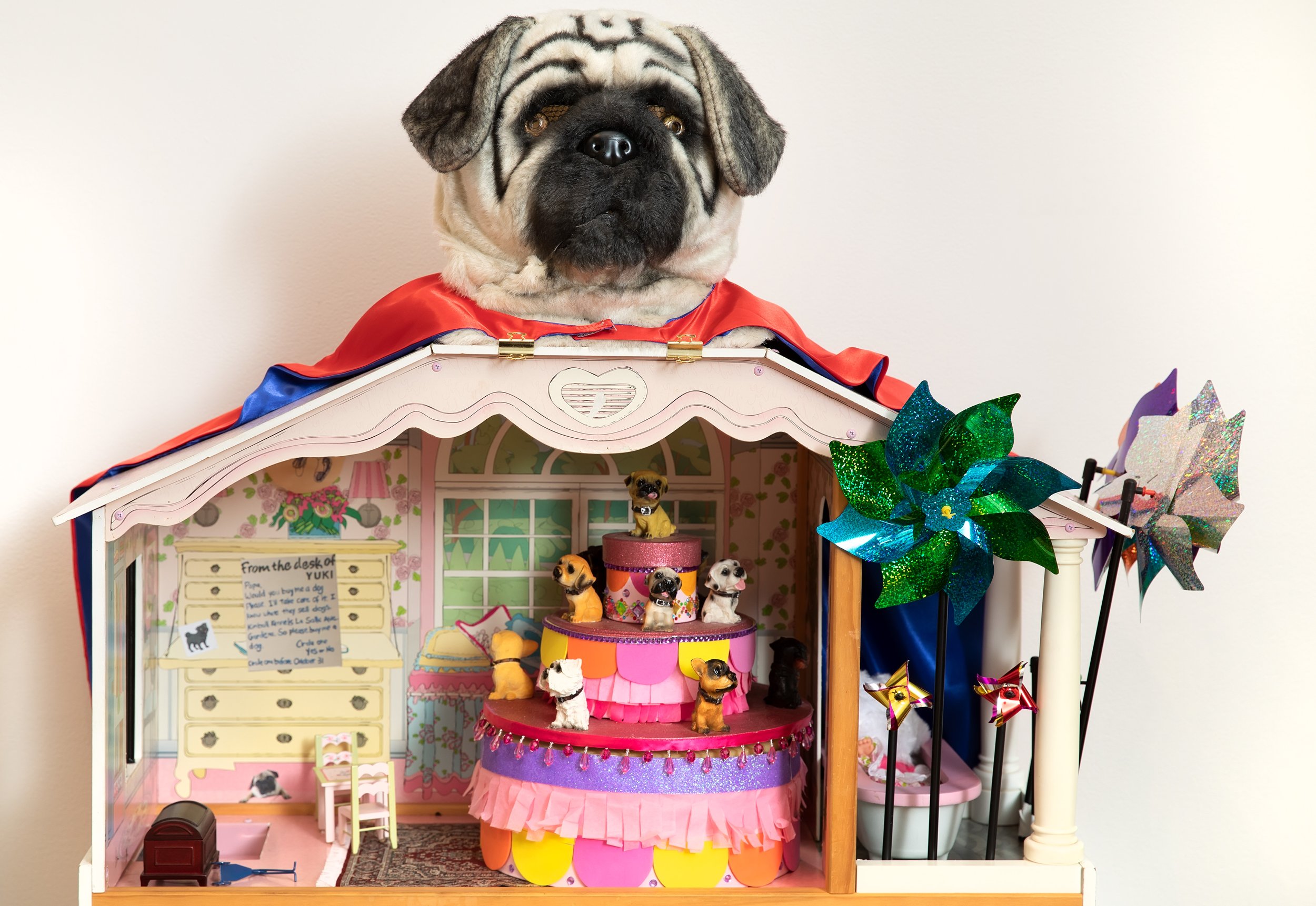 New videos are embedded in Yuki’s dream world: “Super Pug, Super Pug, Super Pug” (2019) on the pet store sales shelf and Super Pug Daydreams and Nightmares (2018) within a pug-themed dollhouse with a rotating, tiered dog cake acting as a nightmarish look into Yuki’s trapped dreams. In these videos, a new cast of characters is introduced, including Super Pug, an imaginary pretend friend and superhero who fights her battles with those naysayers that are not allowing her in real life to have a pet dog. The other three pets in Yuki’s daydreams are Meow (cat), Bubbles (fish), and Chirp (bird), who plead their case as a silent video in each of the three birdcages. Her reality is KOKO’s Love: Episode 1 (2014) that plays on the living room television set.