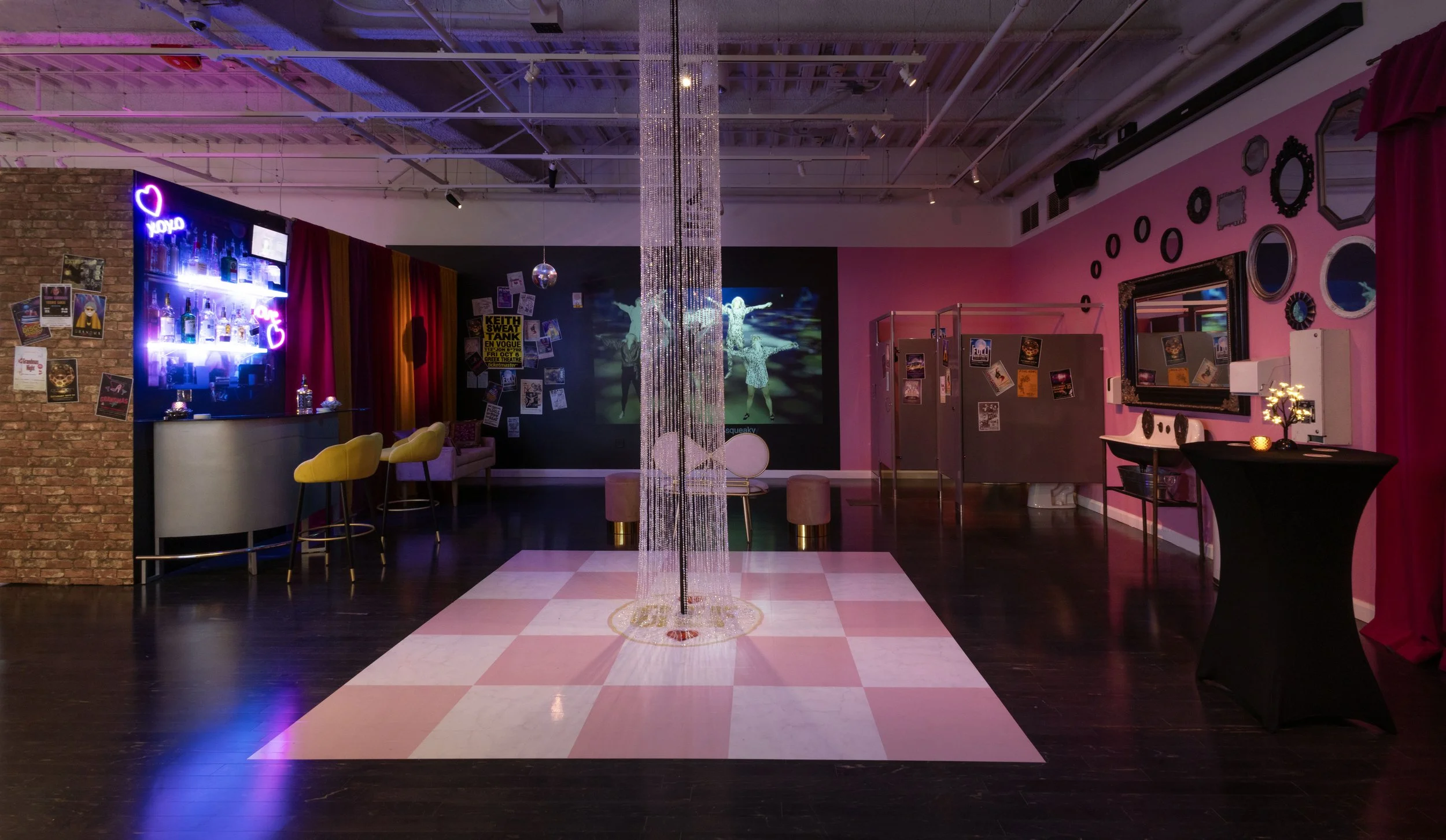 The “Grandma Nightclub” is one component of a future video installation “Grandma Entertainment Franchise (GEF)” that will also include a grandma day spa and a grandma amusement park. There will be a total of three videos playing within the “Grandma Nightclub”—one music video on the dancefloor and two, one each, in the individual restroom stalls. The “Grandma Nightclub Music Video” is a way to celebrate and honor the senior populations and the activities not typically associated with them. I assume the role of five dancing grandmas with the up-tempo and sexual nature of the songs to bring attention to the vitality of the elderly, speaking of ageism embedded in systems of capitalism and entertainment.