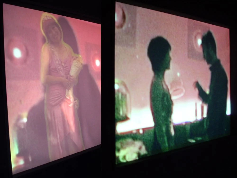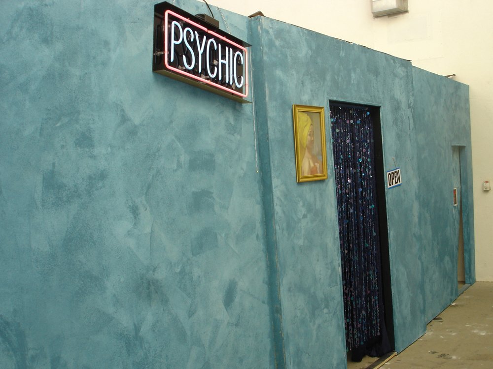 I built a façade of a stucco house with a doorway that led into a dark room with three rear-projected videos playing, acting as windows for the psychic house. When you walk in, straight across is the psychic, and on the right and left are the other two videos that are all playing simultaneously. The psychic reader pronounced grim predictions in love and life. The other two videos flashed such scenarios as dating, a failed marriage, a happy wedding reception, and a beauty pageant. The psychic addresses the visitors as “you” so that they would feel as if they themselves were having their fortunes read and were left to ponder their own insecurities.